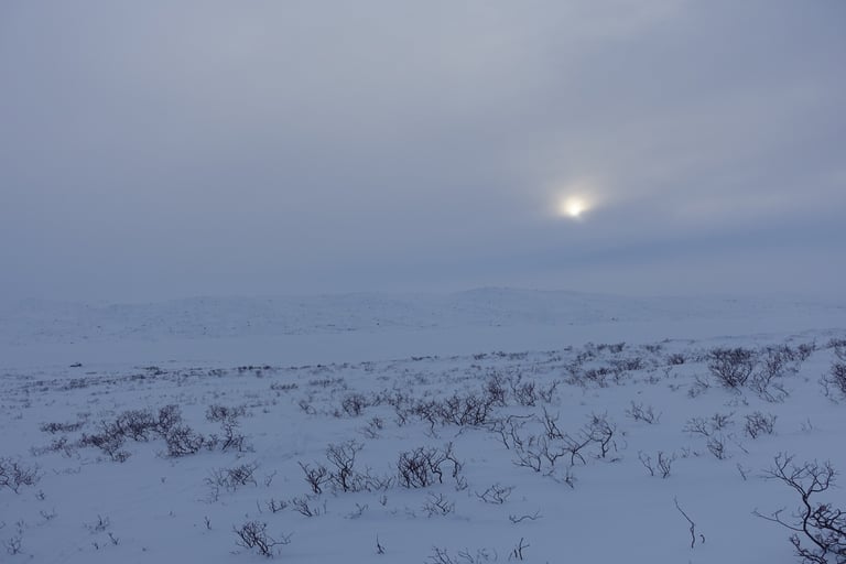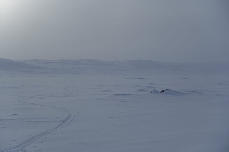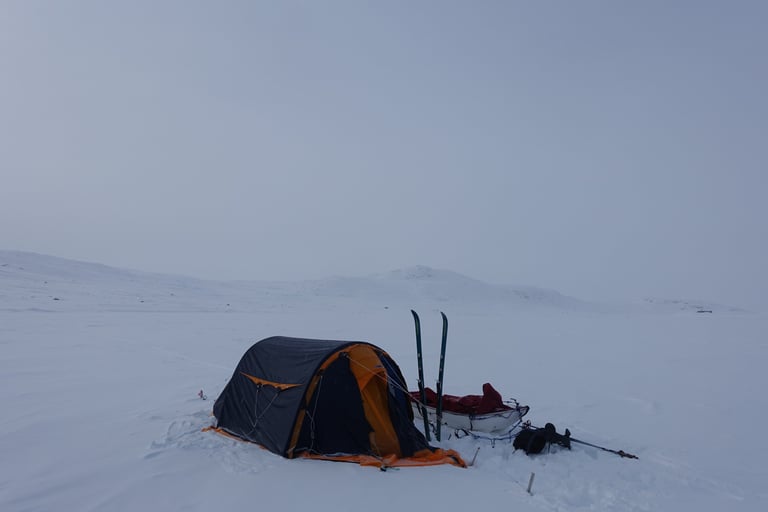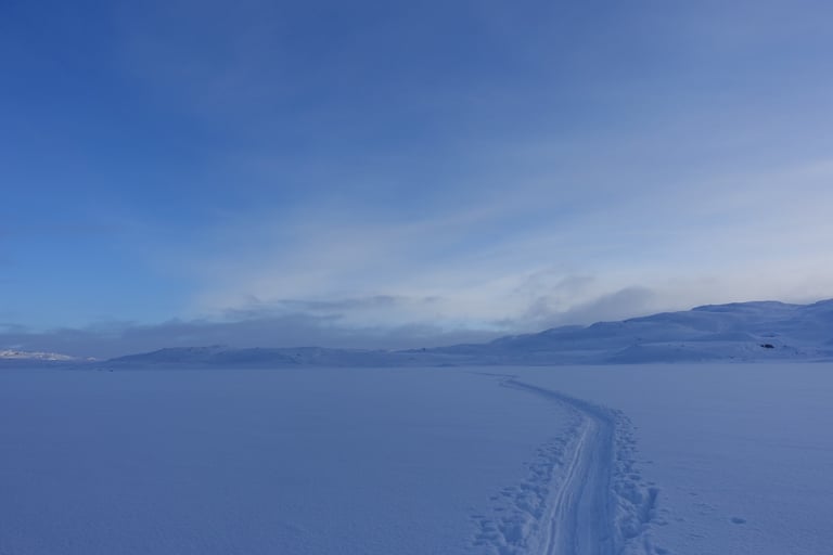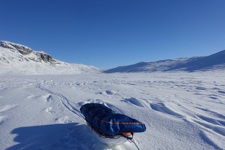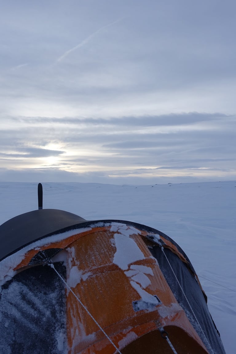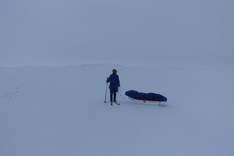 6 jours seule dans le blanc, dans ces paysages immenses et vides. La nature y est reine et forte. Le plaisir d'avancer lentement, en glissant doucement. Le temps de savourer et accueillir l'atmosphère singulière. Apprécier le son précieux du silence quand le vent se tait. Les bruits feutrés des skis qui glissent, le woum de la pulka, les flocons qui tombent comme du velours sur la tente. Le froid piquant au-delà de -25. La gauffre à l'arrivée à Tuva.