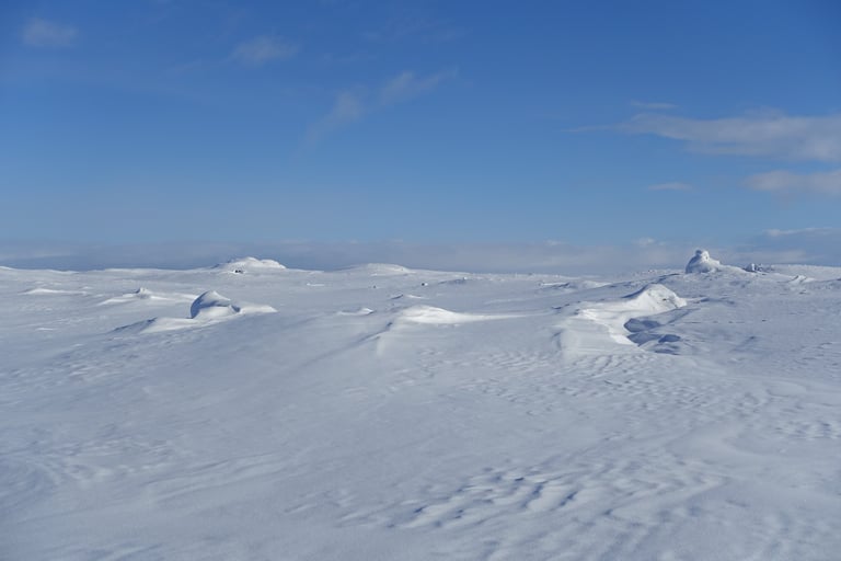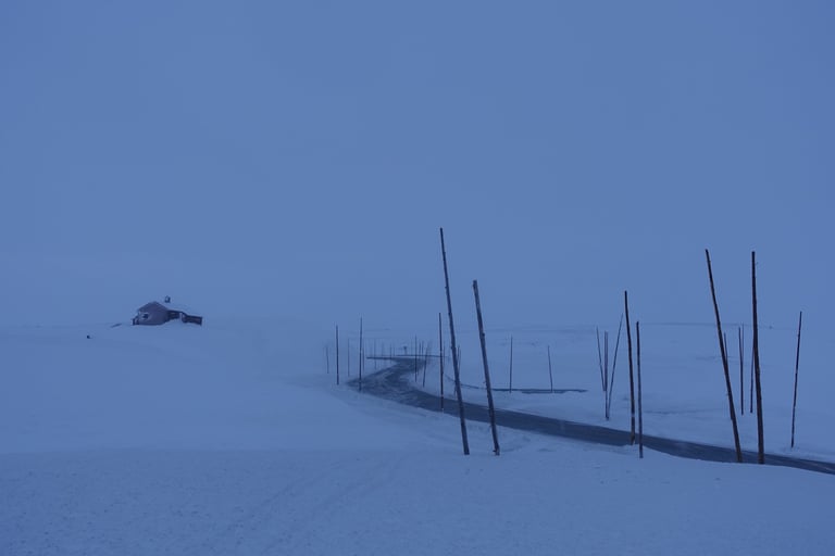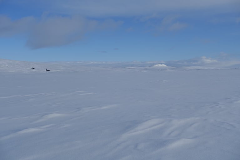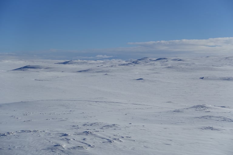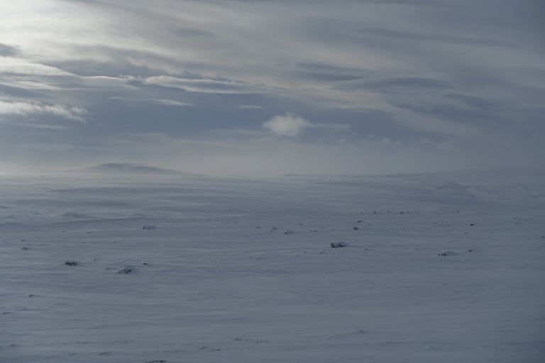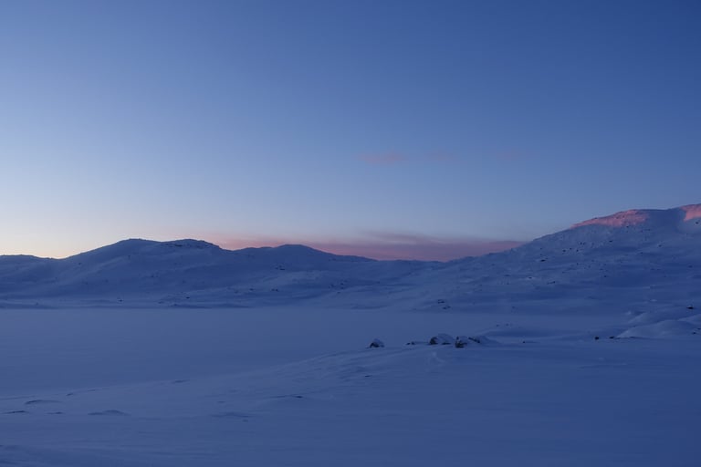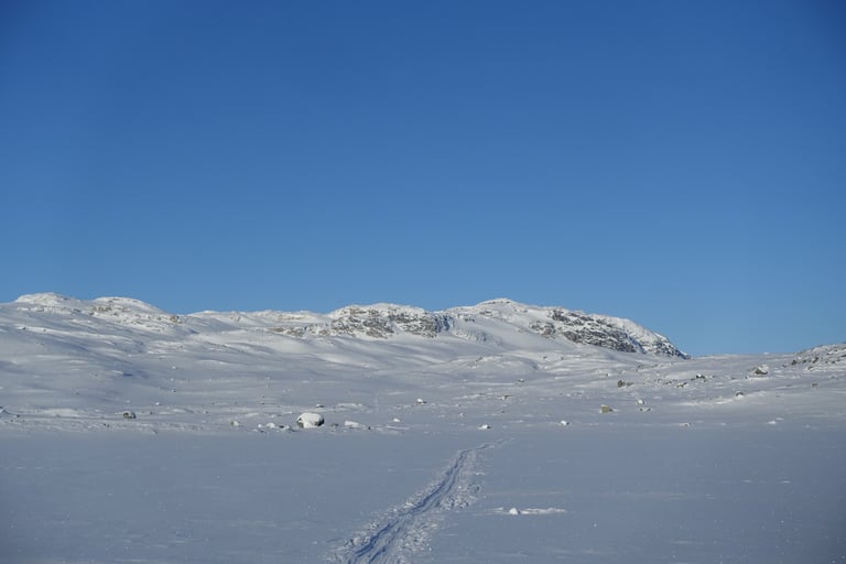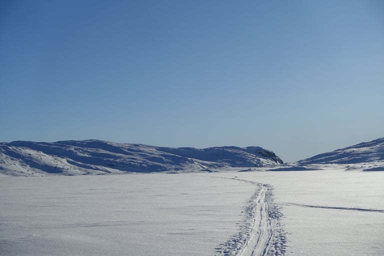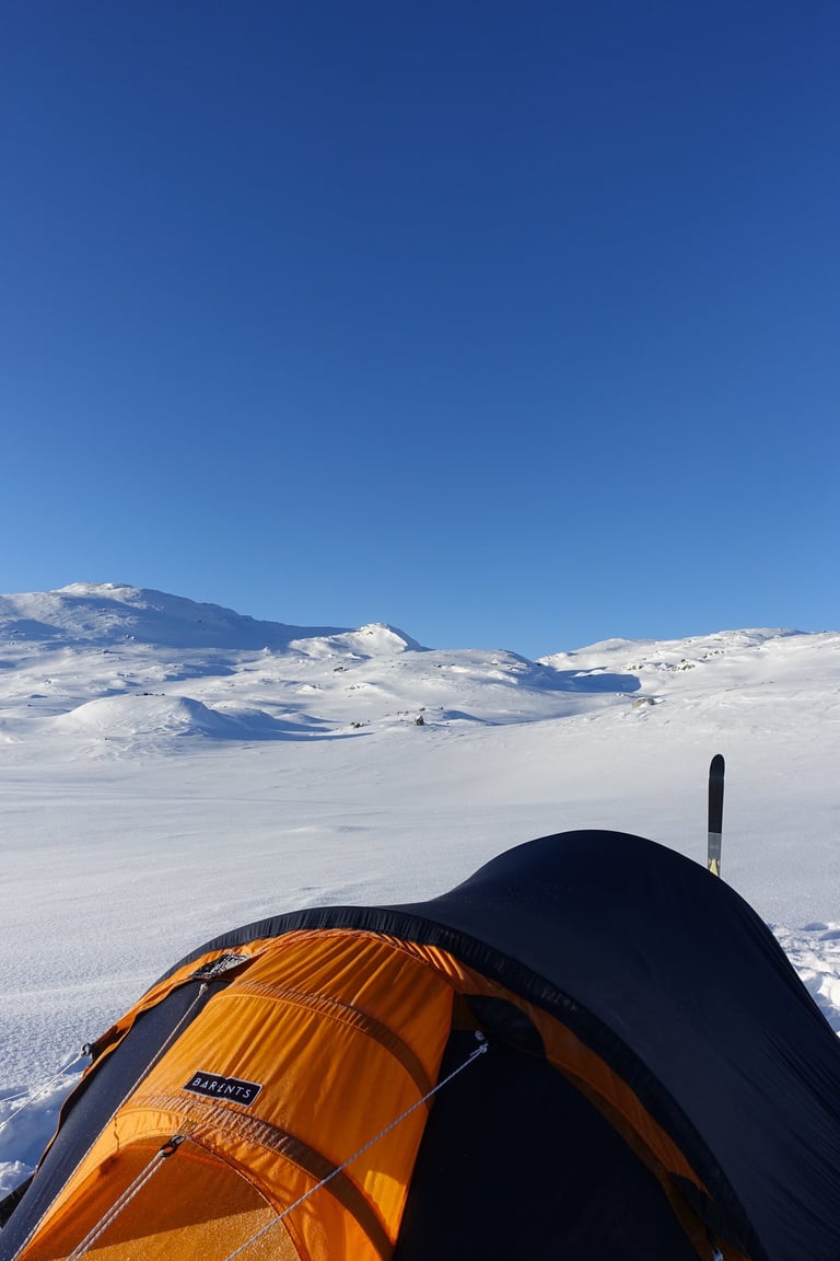 6 jours seule dans le blanc, dans ces paysages immenses et vides. La nature y est reine et forte. Le plaisir d'avancer lentement, en glissant doucement. Le temps de savourer et accueillir l'atmosphère singulière. Apprécier le son précieux du silence quand le vent se tait. Les bruits feutrés des skis qui glissent, le woum de la pulka, les flocons qui tombent comme du velours sur la tente. Le froid piquant au-delà de -25. La gauffre à l'arrivée à Tuva.