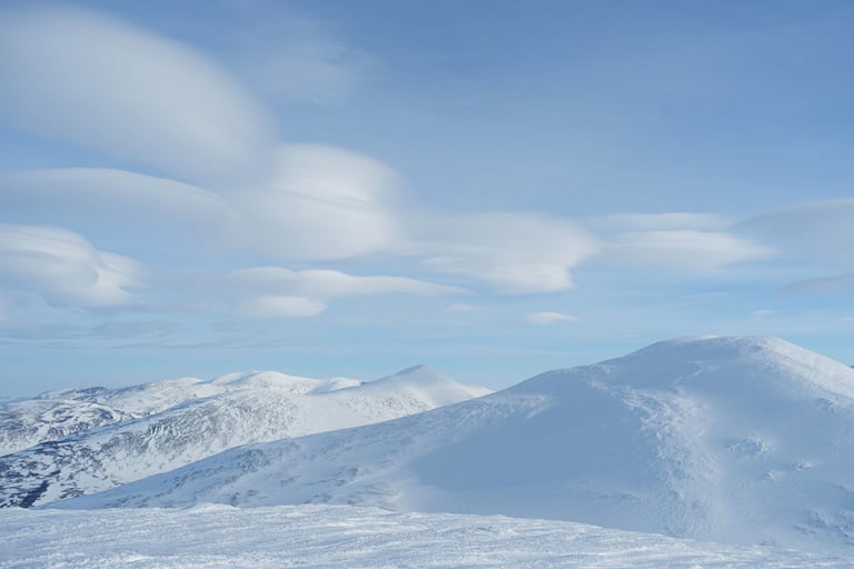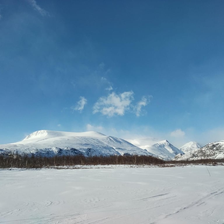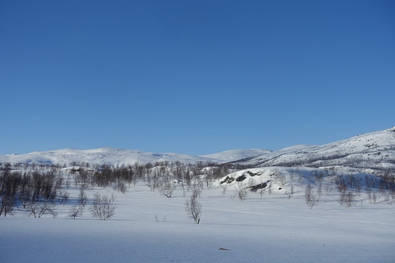 Abisko, que de souvenirs forts ici. Je me rappelle cette arrivée par le train de nuit assise. Épuisée et angoissée de cette première randonnée seule. Puis la rencontre avec ces paysages qui m'aimantent depuis. Cette fois, je suis bien plus préparée et c'est plus sûre de moi que je charge la pulka à la sortie du train. Une visite à la Fjällstation pour le souvenir et c'est parti ! Les premiers kilomètres sont dans la forêt de bouleaux bercée par le bruit de la rivière. Encore une fois la pulka est si lourde avec tout l'équipement. Mais l'étape sera courte aujourd'hui et je prévois un premier arrêt de plusieurs jours. J'installe le camp avec vue sur les sommets prévus pour le ski de rando. Dès cette première nuit, le ciel s'illuminera d'aurores boréales. Elles dansent en draperie. Je chausse les skis et me balade autour de la tente pour me réchauffer, c'est un moment fort.