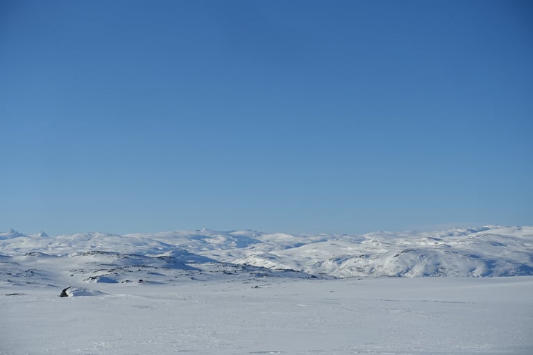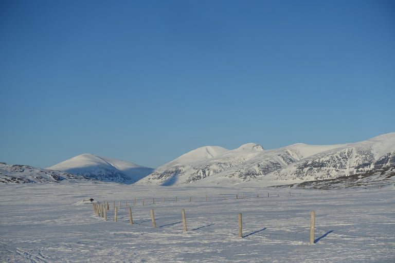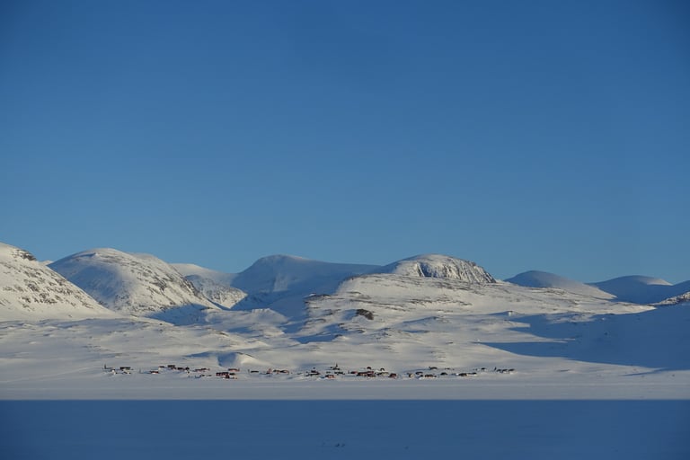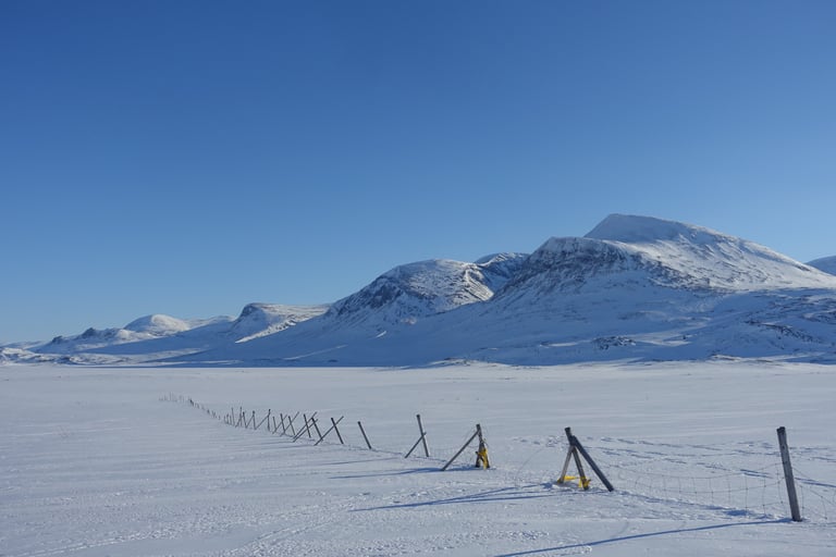 La journée commence par la plus grosse montée du voyage. Il faut en effet passer sur le plateau. Les longues peaux de phoque sont de sorties et pas à pas je m'élève. Puis les arbres se raréfient et des étendues immenses et blanches se dévoilent. Je suis émue. Il est possible de voir au loin les sommets norvégiens. En avançant, je croise des clôtures pour l'élevage des rennes, ainsi que des lieux de rassemblements. C'est un lieu important en été pour les Sami, en témoigne le village au bord du lac. Les derniers kilomètres se déroulent sur le lac gelé, c'est beau d'être au milieu des ces montagnes. Le refuge s'approche et je décide de rester à l'intérieur. Du vent fort est annoncé et ma tente ne résisterait probablement pas. Je me rappelle surtout de mon premier passage que le sauna a une vue à couper le souffle (dernière photo). Et après 3 jours dehors, j'en meurs d'envie !