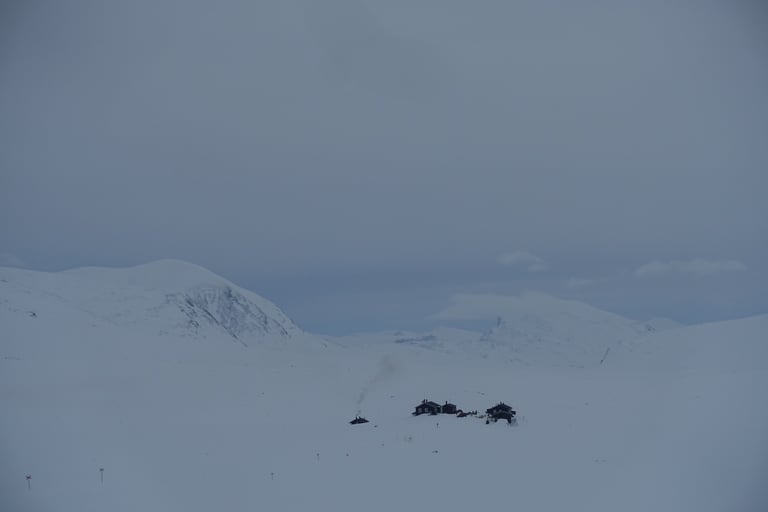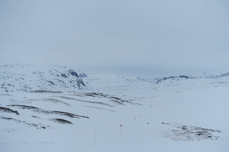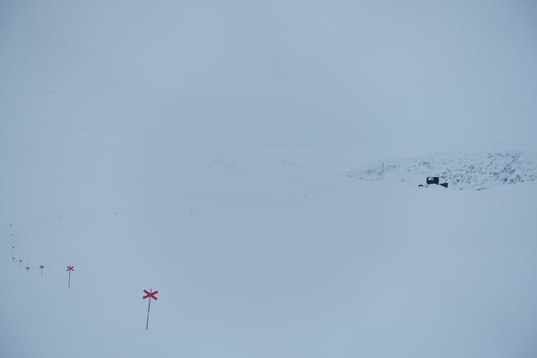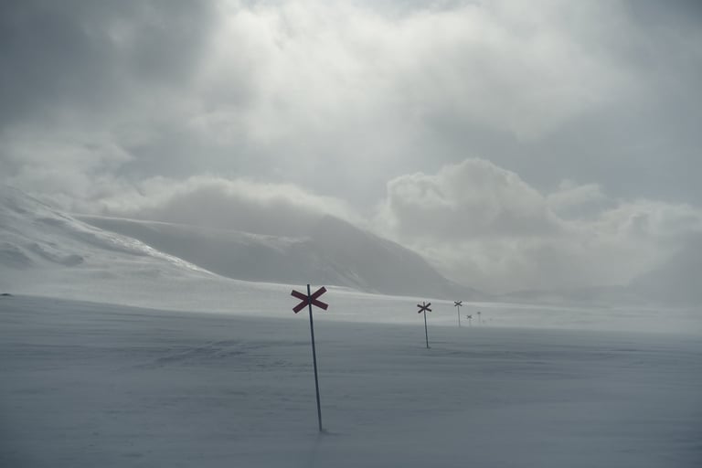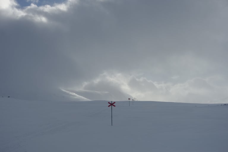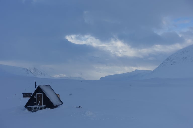 Le temps a bien changé pendant la nuit. Les prémices de la tempête sont là. Tout est blanc avec quelques reliefs qui se dévoilent, il y a une ambiance mystique. Les croix indiquant le chemin tranchent rompent le monochrome. Je skie vite, je suis en forme et une envie de découvrir ses paysages m'habite. De belles rencontres à la pause déjeuner au refuge de Tjäktja. Puis je repars pour doubler l'étape du jour. La motivation est double : profiter du petit créneau météo et surtout de s'installer dans le refuge avec sauna pour la tempête. Beaucoup de vent jusqu'au col, dans cette montée chargée de souvenirs. En 2014 j'avais de la neige au genoux en juin ! Puis la descente dans l'autre versant signe le retour du calme. Il y a le silence total, seulement rompu par le glissement des skis. Je fais donc plusieurs pause pour profiter de cet instant suspendu. Arrivée tardive à Sälka, où il y a déjà beaucoup de monde, quel contraste ! Quelle chance, le gardien me propose une petite chambre seule, grand luxe ! La soirée sera remplie de rencontres très enrichissantes, qui ont nourri mon envie de me former comme guide polaire.
