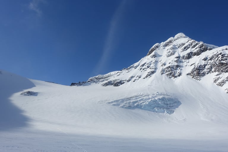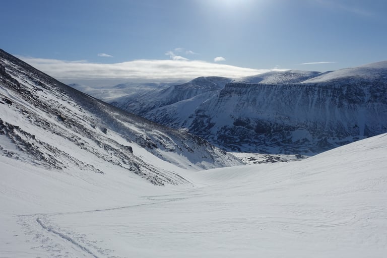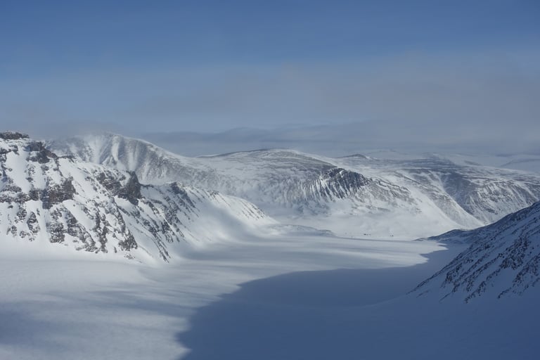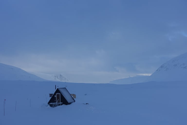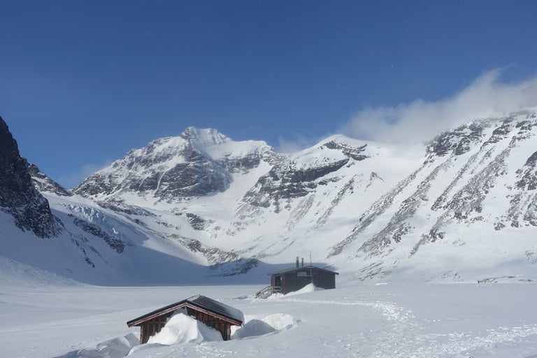Le beau temps revenu, c'est l'heure du plan diabolique ! Cette journée restera comme une de mes plus belles à skis. La balade commence par la remontée du couloir de Jökelbäcken, où je retrouve un groupe qui part faire l'ascension de Kebnekaise. Je bifurque vers le col de Södra Nischen. Le panorama est sublime, je longe Kebnekaise, avec la vue sur le massif. Puis, au col le bassin du Storglaciären se dévoile. Le glacier porte bien son nom, il est immense. Tout est immaculé après les chutes de neige. Je prends bien mon temps pour analyser les conditions avant de m'engager seule sur le glacier. Je choisis notamment une ligne sans cassure de pente pour minimiser le risque de crevasse. Les conditions sont excellentes et il y a des mètres de neige cette saison. C'est un régal, et quel sentiment, seule dans cette immensité ! Le voyage continue avec la remontée vers le refuge de Tarfala. C'est une vallée à caractère alpin, très surprenant pour la Suède. Le refuge est un bijou. Je m'y arrête seulement pour faire connaissance avec le gardien et déposer mes affaires pour la nuit. J'ai encore envie de skier et il me conseille une belle pente. La neige y sera si bonne que je remonterai une deuxième fois ! Mais l'heure tourne et il est temps d'aller profiter du sauna avec vue panoramique. Je serai seule au refuge ce soir donc c'est un moment hors du temps.