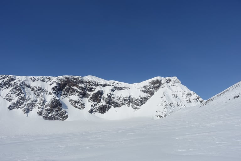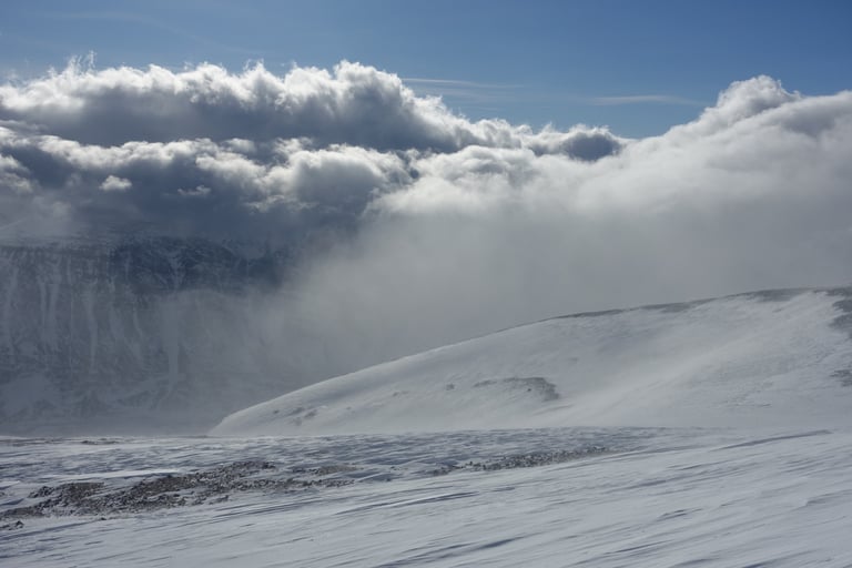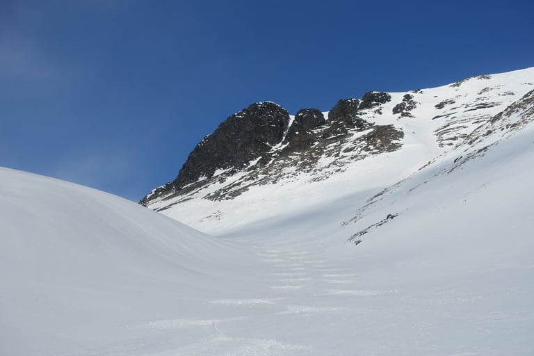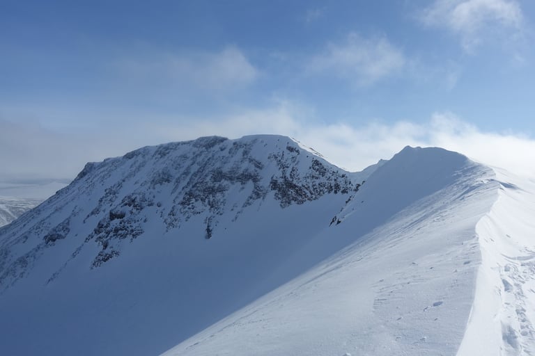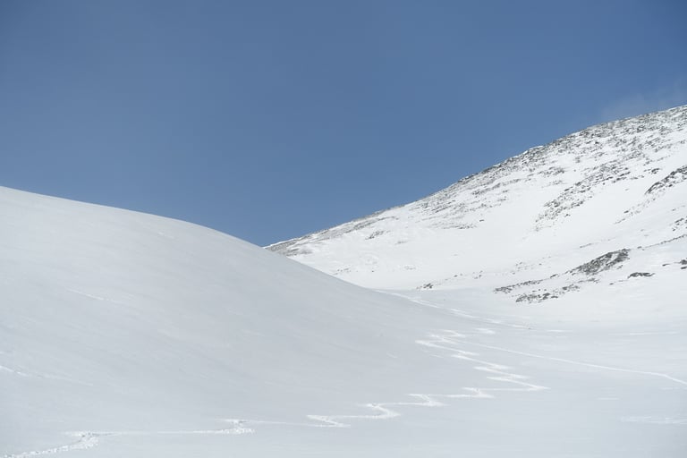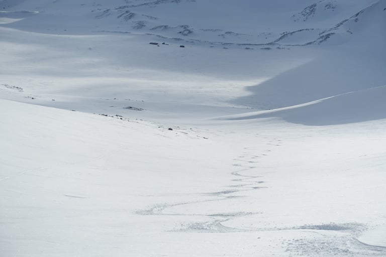 Le vent souffle fort avec des rafales à plus de 125 km/h. Tout le refuge craque avec le bois qui vit. L'épisode durera plusieurs jours. Il va même pleuvoir, c'est tellement surprenant pour la région ! Le grand nord est vraiment touché de plein fouet par le changement climatique... La première tentative de sortie tourne vite court, je n'arrive pas à garder les bâtons verticaux sous les rafales. Quelques accalmies me permettent de suivre les conseils précieux des guides locaux, merci à eux ! Le couloir de Jökelbäcken est une pépite bien protégée et il y a un champ de poudreuse malgré la tempête, le rêve. Malheureusement, dès que j'en sors au-dessus vers Kebnetjåkka, tout est soufflé et il ne reste pratiquement plus de neige.