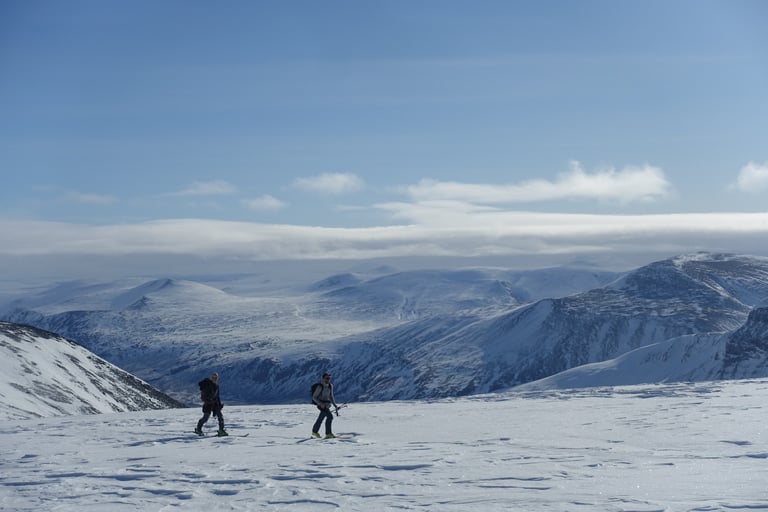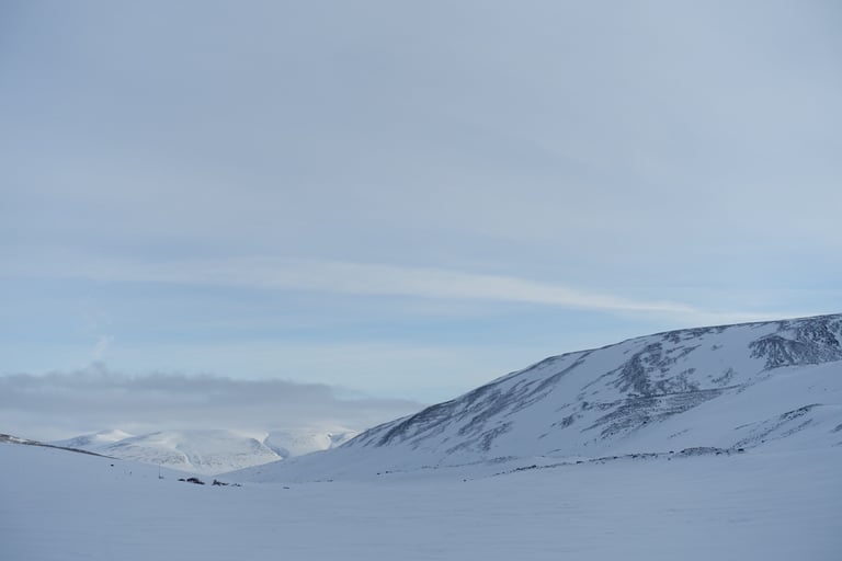 Aujourd'hui je troque la pulka et les skis nordiques pour l'ascension du Giron. Magique de partir depuis la tente. La première partie est une navigation à travers la forêt de bouleaux. Il a plu les derniers jours, j'évolue donc sur du verglas. Ce sera donc du grand ski. Mais peu importe, l'atmosphère est dingue, je suis seule dans cette étendue blanche. Je croise quelques rennes sous le sommet, ils cherchent leur nourriture à travers ce sol gelé. Ces épisodes de verglas sont une catastrophe pour eux, cela les prive de lichen qu'ils ne peuvent atteindre. La vue est sublime, tout le massif de Kebnekaise se dévoile au sud, et le lac gelé au nord. Retour à la tente après du patinage sur cette glace, pour déguster un bon plat lyophilisé, festin !